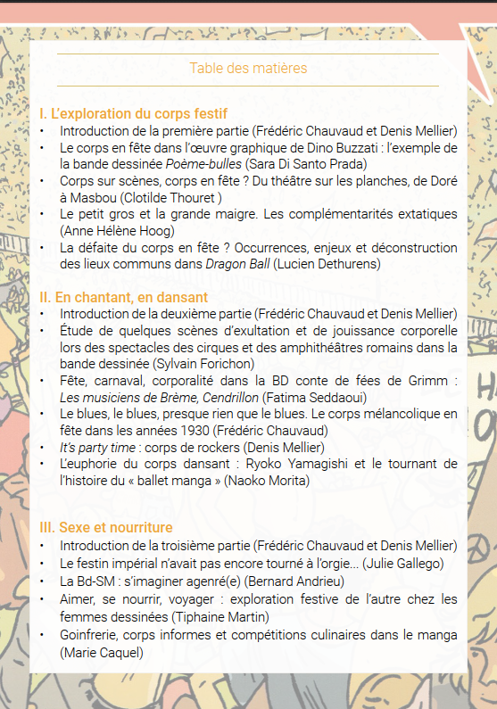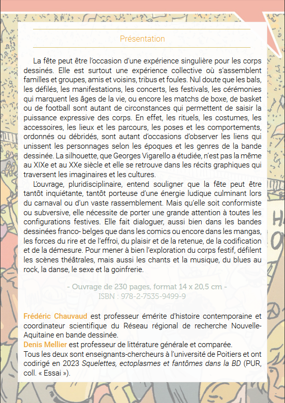 Le 16 mai, le volume Corps en fête dans la bande dessinée dirigé par Frédéric Chauvaud (CRIHAM) et Denis Mellier (FoReLLIS) est publié aux Presses Universitaires de Rennes en association avec l’Université de Poitiers et avec le soutien du 3RBD. Le volume contient des contributions sur l’histoire de la bande dessinée francophone, sur le manga et jusqu’au BD-SM, de la part de jeunes chercheureuses et d’éminent-es spécialistes.