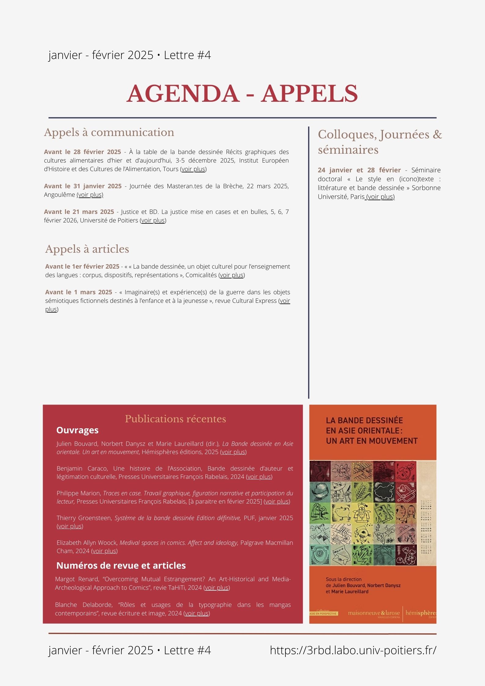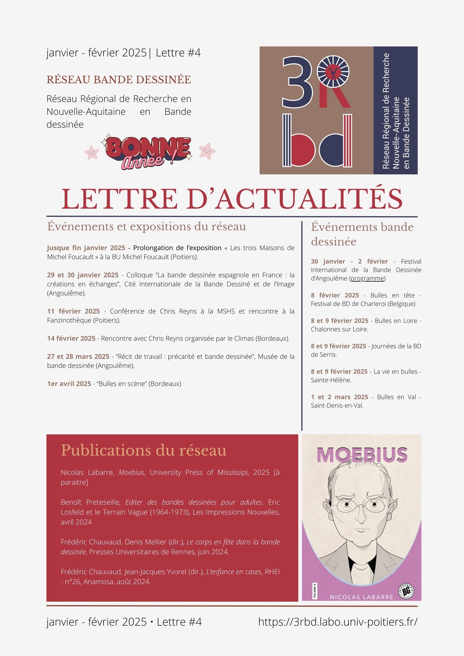 Retrouvez ici la lettre d’actualités du Réseau Régional de Recherche en Nouvelle-Aquitaine en Bande Dessinée avec les actualités du Réseau et les actualités de la Recherche en Bande dessinée.